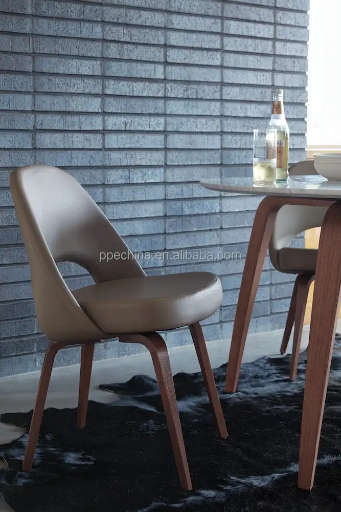* Contoured plywood seat * Steel leg base * Solid steam-bent wood legs or seamless tubular steel legs with chromed finish * Fabric, suede, or leather upholstery |