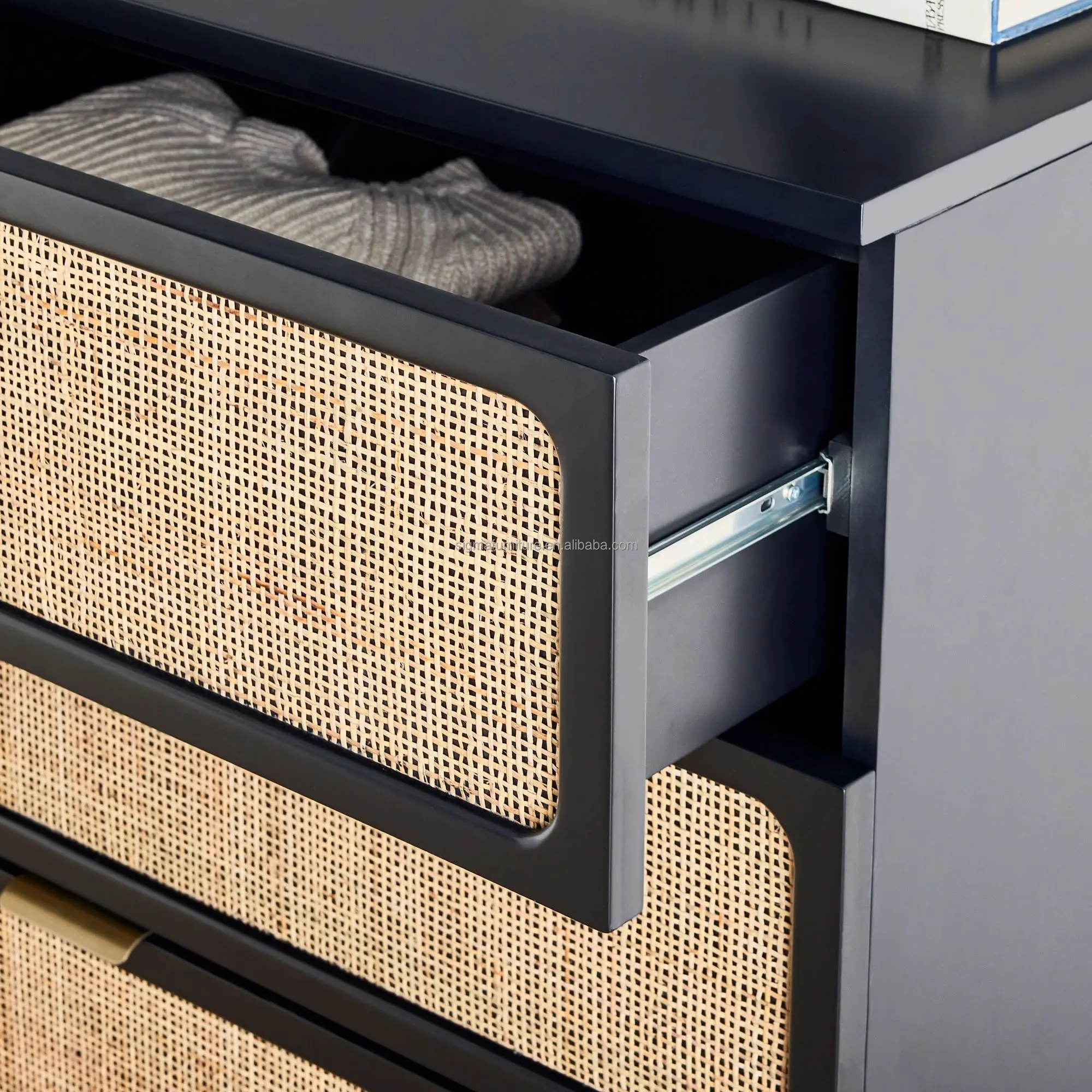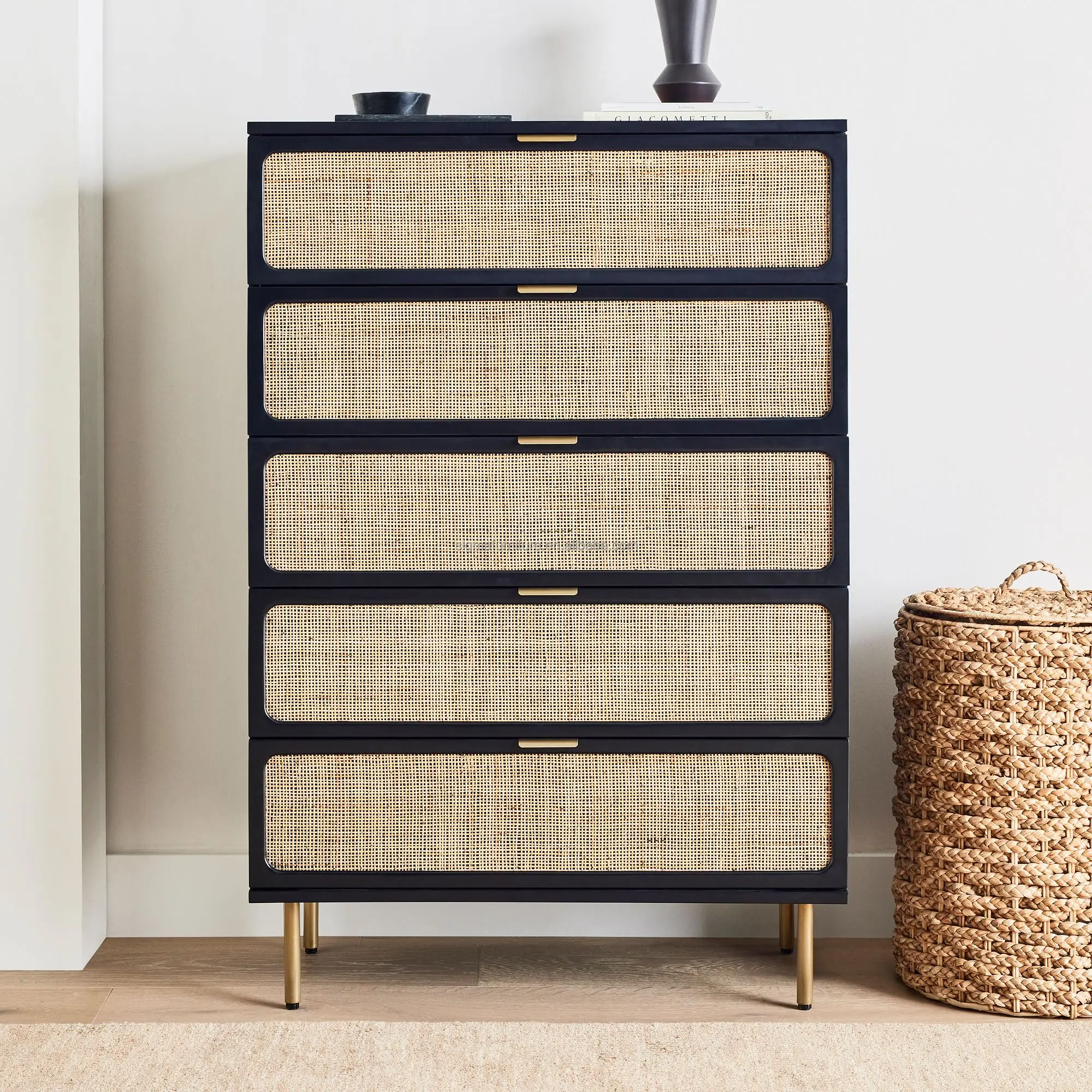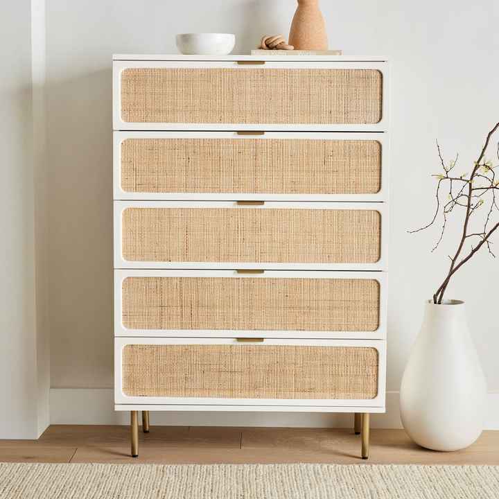 Modern Tall White Solid Wood Rattan Weaving Black Dresser 5 Drawer Storage Chest Of Drawers Bedroom Dressers