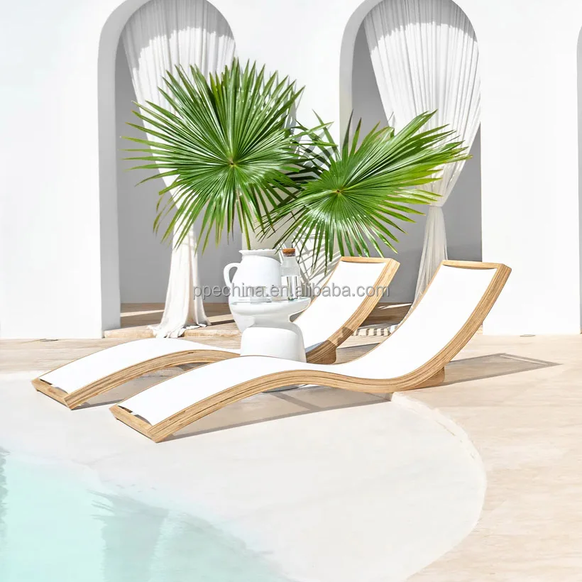 New fashion pool side chaise daybed teak and outdoor fabric sling seat curved sun loungers