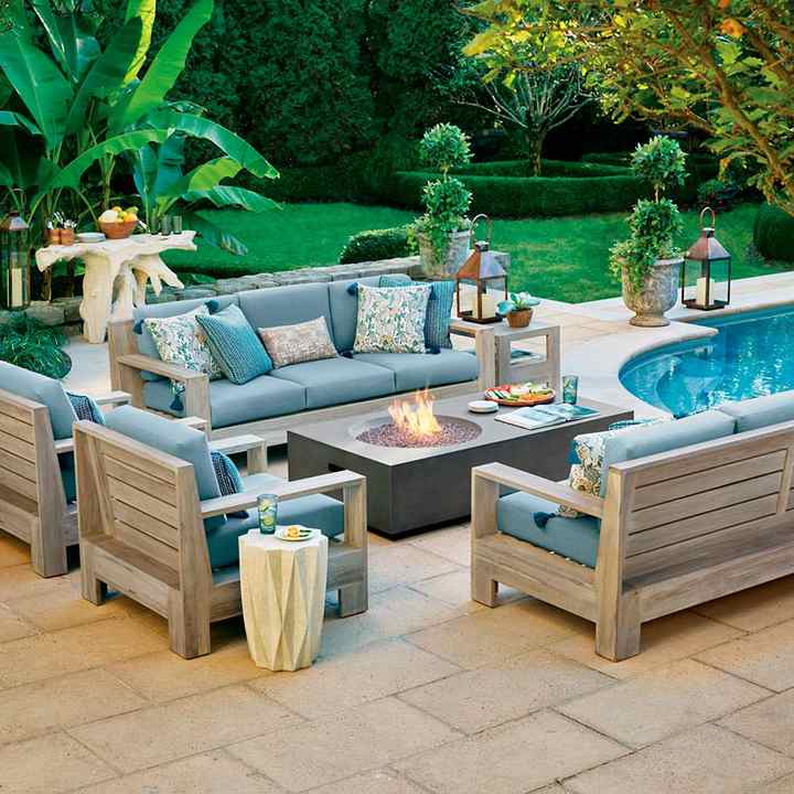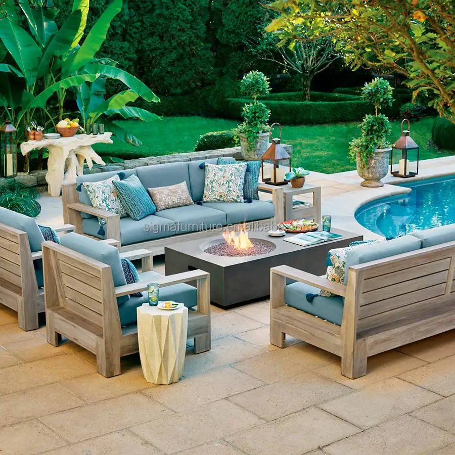Waterproof modern weathered wooden sofa set home and garden teak furniture outdoor with cushion