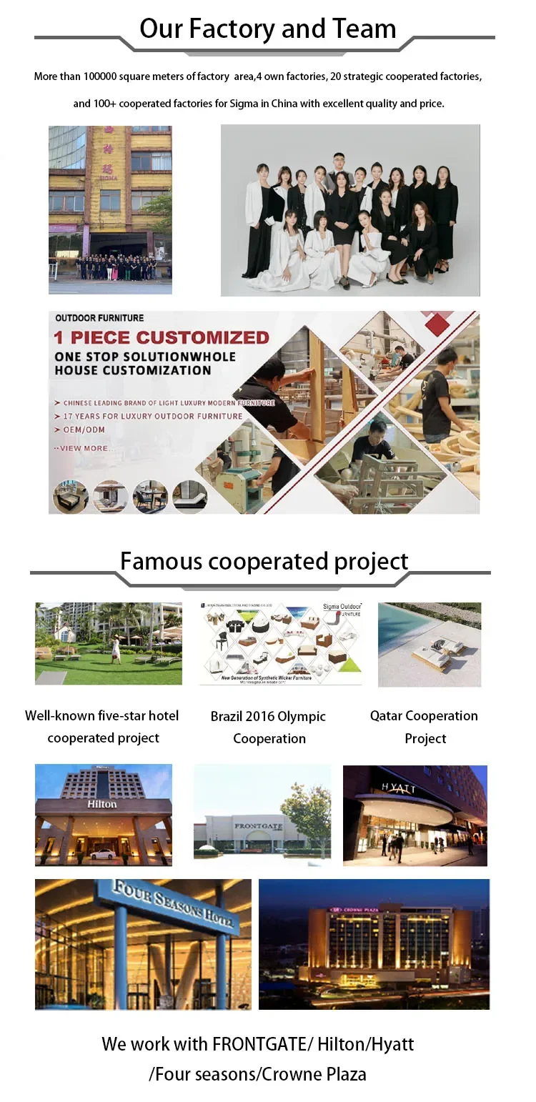 Sigma furniture is a professional company of supplier of outdoor furniture - Special in Rattan furniture , Teak furniture, Aluminium furniture, rope furniture and Outdoor fabric furniture . We have experience of 15 years of furniture industry .